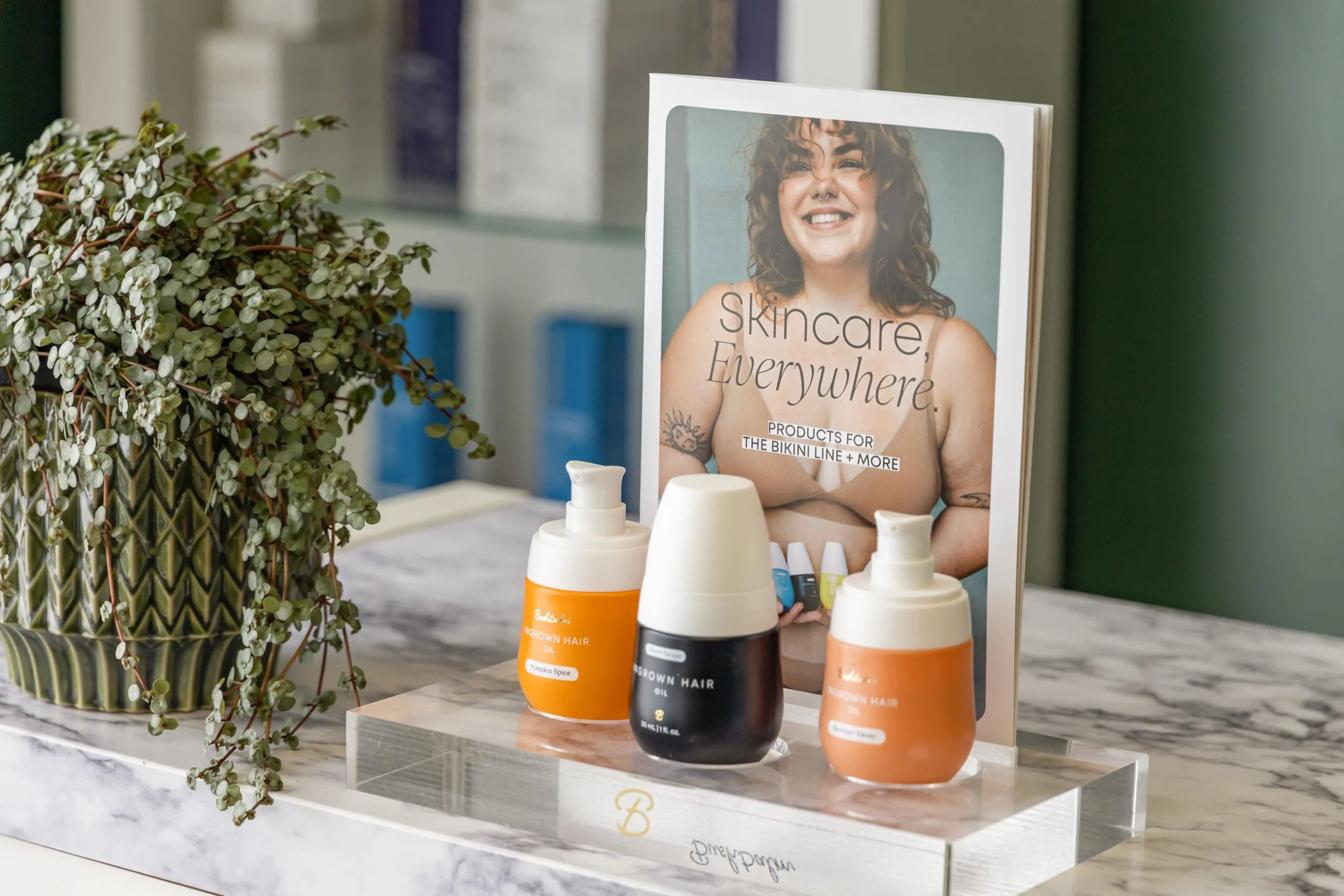 Front desk at Selkie, featuring Pumpkin Spice, Sweet Escape, and Summer Vacay Ingrown Hair oil from Bushbalm - Our in house after care system.